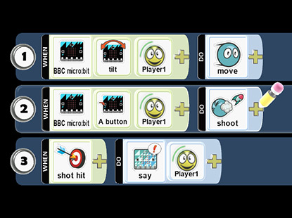 Kodu can scroll text across the micro:bit’s LED display. In this example, we scroll the word “SCORE!” whenever one of our shots hits something. See how it's done in the video above.